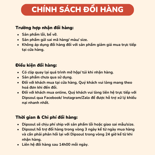 🔸Thời gian: Dipsoul hỗ trợ đổi hàng trong vòng 3 ngày kể từ ngày bạn nhận được hàng. Liên hệ đổi hàng sau 14h00 mỗi ngày.